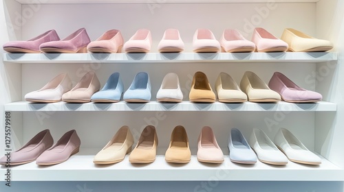 A high-end boutique display showcasing stylish ballet flats in a variety of soft pastel shades