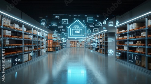 futuristic, logistic, hub, aisle, shelf, warehouse, technology, automation, storage, inventory, distribution, delivery, supply, retail, lighting, digital, network, system, datum, efficiency, industrial, modern, smart, robotic, conveyer belt, merchandise, good, package, product, transportation, management, organisation, future, innovation, optimization, infrastructure, facility, processing, fulfillment, commerce, economy, enterprise, digitization, productivity