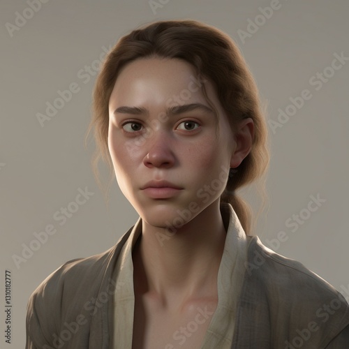 A highly detailed, hyper-realistic close-up portrait of an AI-generated human face. This digital artwork features lifelike skin textures, expressive eyes, and natural lighting.
