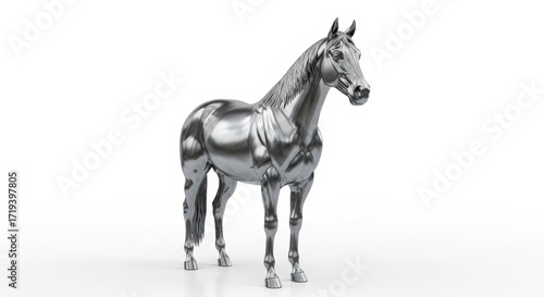 A highly detailed, realistic 3D render of a metallic horse sculpture standing on a white background.