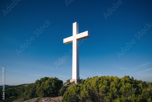 A high-quality photo of a big white cross against a clear blue sky