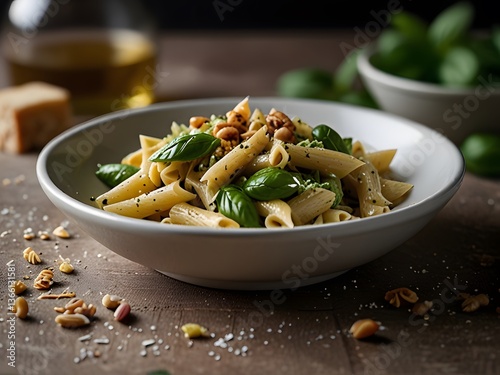 A high-quality, realistic photograph of a plate of penne pasta coated in rich, creamy green pesto sauce