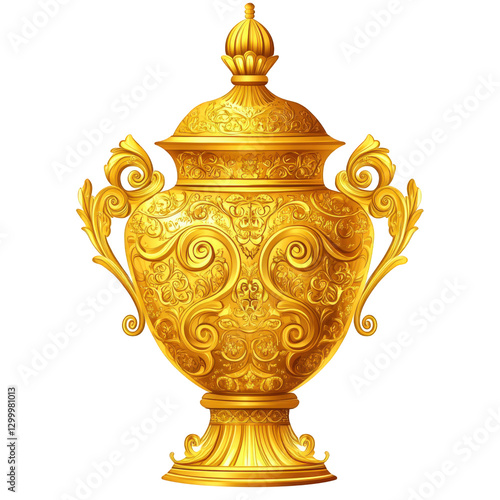 A high-quality vector-style illustration of a traditional golden censer, beautifully embossed with detailed swirling patterns and floral motifs, transparent background, PNG