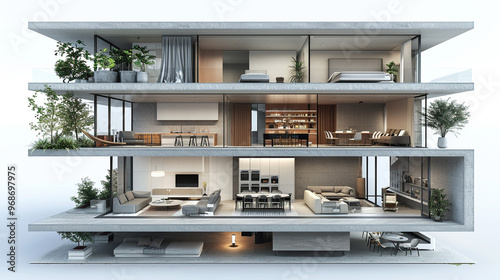 A high-resolution 3D rendering of a modern house cross-section showing a luxury penthouse with an open-plan living area, high-end kitchen appliances, and a panoramic view of the city skyline.