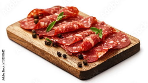 A high-resolution product photo of premium marbled meat slices neatly arranged on a wooden board, vibrant and fresh red tones with subtle marbling patterns, bright white background creating stark cont