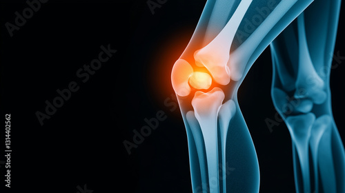 A high-resolution X-ray of a human knee joint, with the pain area glowing in an intense red-orange hue, symbolizing severe discomfort and inflammation.
