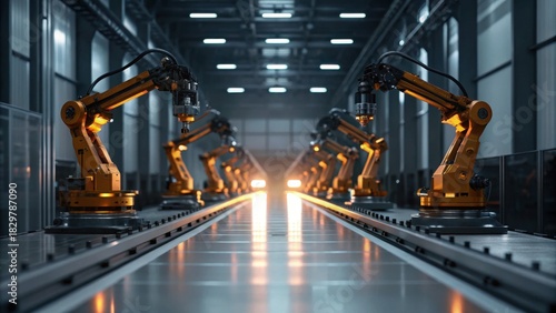 A high-tech industrial setting with robotic arms aligned along a production line, illuminated by overhead lights.