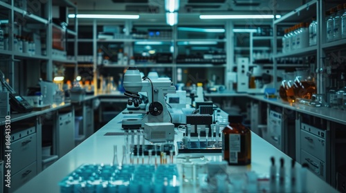A high-tech laboratory with scientists conducting experiments, advanced equipment, and innovative research