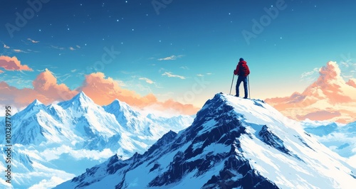 a hiker standing triumphantly on top of a mountain, set against a stunning winter landscape with a bright blue sky
