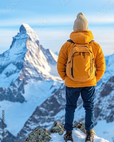 A hiker stands on a snowy mountain peak, gazing at the majestic Matterhorn, dressed warmly for an adventurous trek.
