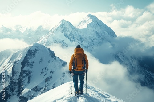 hiker, mountain, snow, peak, adventure, exploration, trekking, nature, climbing, summit, landscape, travel, scenery, cloud, winter, wilderness, sport, solitude, altitude, challenge, beauty, freedom, rugged, hiking, gear, panoramic, view, seeker, exercise, fresh, air, scenic, elevation, journey, breathtaking, remote, activity, lover, pole, foothill, alpine, spirit, vibrant, sky
