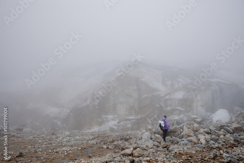 hiker, rocky, terrain, fog, mountain, landscape, mystery, nature, outdoors, adventure, exploration, travel, person, female, young, purple, clothing, cloud, scenery, environment, wilderness, climate, weather, expedition, journey, isolated, remote, scenic, view, natural, geology, stone, boulder, hill, peak, summit, wild, rugged, landform, topography, elevation, atmosphere, serenity, calmness, solitude, explorer, hiking, activity, fitness
