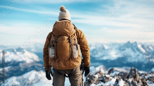 A hiking enthusiast surveys the snowy mountainscape, evoking feelings of introspection and appreciation for nature's grandeur and the thrill of overcoming challenges.