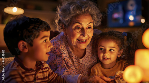 grandmother, storytelling, children, family, hispanic, cosy, indoor, evening, joy, engagement, love, warmth, bonding, laughter, tradition, culture, memory, connection, light, smile, happiness, children, sitting, together, home, playful, sharing, moment, affection, entertainment