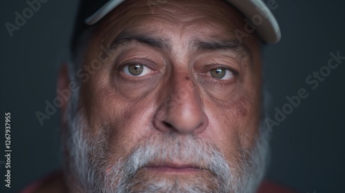 portrait, hispanic, man, contemplative, studio, expression, realistic, portraiture, closeup, detailed, feature, lighting, gaze, personality, individual, candid, emotion, character, depth, texture, face, eye, beard, cap, artistry, mood, visual, capture, moment, style, narrative, authenticity, background, serenity, sharpened, age, story, craftsmanship, documentary, atmosphere