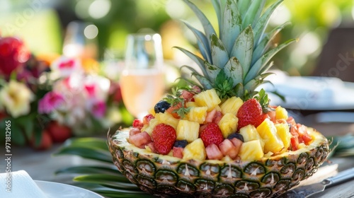A hollowed-out pineapple filled with fruit salad, served as a refreshing tropical dish at an outdoor brunch.