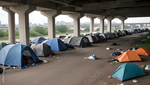 A homeless encampment under a highway overpass, with tents, tarps, and other makeshift shelters scattered across the ground