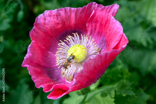 A honeybee is shown collecting pollen from a vibrant pink poppy flower. The bee is gathering pollen to bring back to its hive to feed the colony. This symbiotic relationship benefits both.