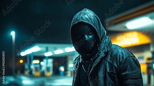 night, rain, hooded, figure, mask, black, gas, station, background, dark, mysterious, ominous, silhouette, shadow, street, urban, city, street light, wet, grunge, moody, eerie, creepy, scarey, danger, crime, thriller, suspense, mystery, detective, action, drama