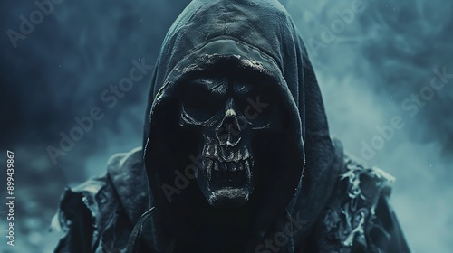 A hooded figure with a skeletal face and hollow eyes, glaring menacingly.