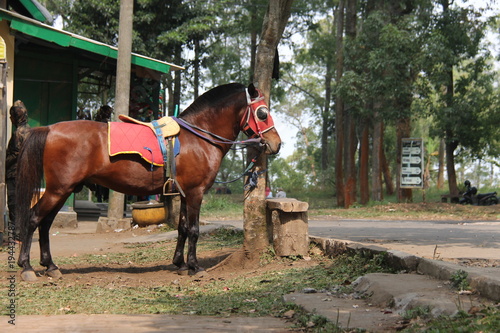 a horse tied to a tree