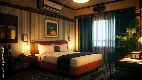 A hotel room with a luxurious feel, featuring a wall-mounted air conditioner blending seamlessly with the interior.
