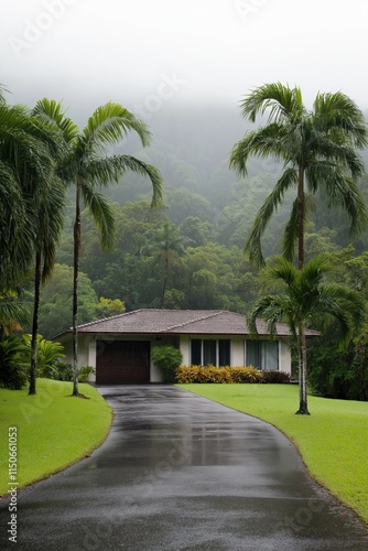 house, driveway, front, wet, tree, nature, architecture, landscape, green, travel, summer, beautiful, tour tourism, vacation, outdoors, tropical, beach, sky, building, holiday, view, home, blue, wooden, resort, residential, village, garden, mountain, asia, island, palm, plant, forest, traditional, water, outside, villa, property, estate, paradise, nobody, hotel, rural, roof, relax, exterior, thai, luxury