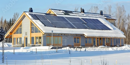 A house with installed solar panels on the roof in winter, covered with snow. Electrical production in winter, generation problems and panel care