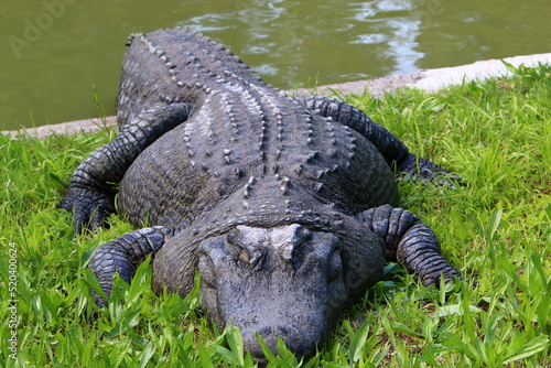 A huge crocodile lies on the grass on the banks of the river.