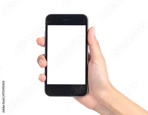 hand, phone, smartphone, holding, device, screen, blank, white, technology, digital, mobile, touch, communication, connection, isolated, black, modern, person, finger, thumb, wrist, arm, closeup, view, contraption, display, space, content, image, empty, portrait, lifestyle, studio, clean, simple, transparent, interface, application, web, browsing, social, network, texting, calling, camera, front, profile