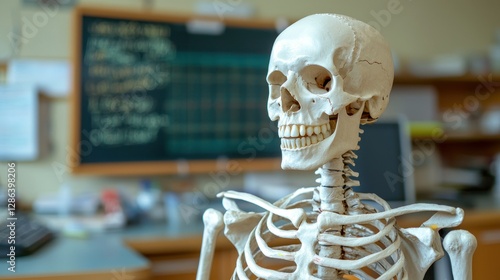 A human skeleton model in a classroom, used for anatomy teaching.