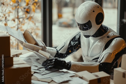 robot, android, artificial intelligence, ai, automation, technology, future, science fiction, robotic, work, office, desk, paperwork, document, sorting, logistic, shipping, efficiency, precision, white, black, visor, metallic, futuristic, machine, men at work, labor