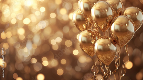 A hyper-realistic scene of floating gold balloons with glossy ribbons in a serene dance, against a backdrop of dreamy bokeh lights, AI Generative