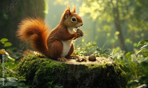 A Illustration of a cute Squirrel sitting on a tree Stump in a beautiful Forest, enjoying some Nuts. Ideal for Nature and Animal Themed Content.