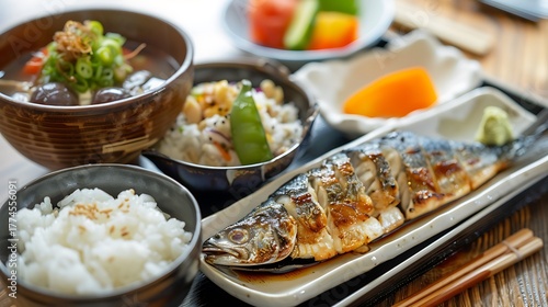 japanese, grilled fish, rice, soup, miso soup, fish, food, cookery, asian cuisine, meal, dinner, lunch, traditional, dish, eatery, table, plate, bowl, healthy, delicious, epicure, fresh, cooking, seafood, salmon, tasty, nourishment, diet, vegetable, green, orange, white, black, brown, closeup, still life, indoor, presentation, style, culture, travel, holiday, tour tourism, asia, japan
