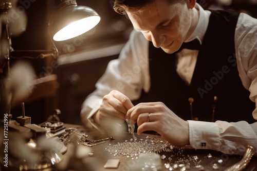jeweller, jewellery, craftsmanship, workbench, tool, sparkling, precision, handcraft, dedication, skill, patience, creativity, artisanship, meticulous, goldsmith, silversmith, inspection, sharpened, glow, engagement, craft, making, luxury, handiwork, ornament, metalwork, artisan, designer, engraving, customization, workshop, creation, intricate, stone, gemstone, emerald, examine, excellent, manual
