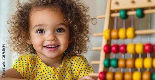 A joyful Black girl in a yellow polka dot dress smiles while playing with a colorful abacus in a bright classroom setting