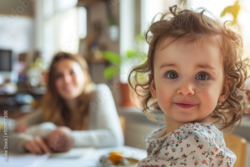 A joyful child smiles warmly in a cozy, sunlit family setting.