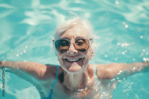 A joyful elderly woman with sunglasses happily swimming in a pool, embodying leisure and positivity
