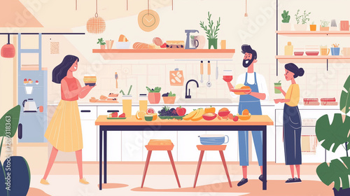 A joyful family enjoying a healthy breakfast in a bright kitchen, with fresh fruits, smoothies, and a cozy, inviting atmosphere, creating a perfect start to the day.