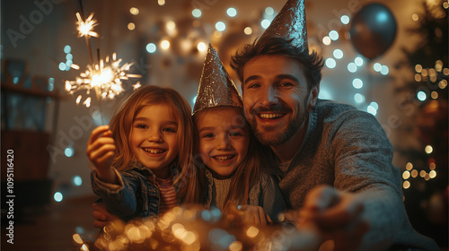 A joyful family wearing New Year’s party hats