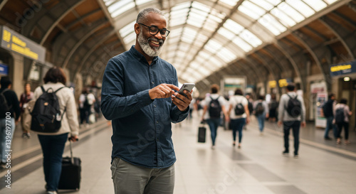 A joyful mature man smiles while checking his phone, navigating a bustling train station, feeling connected and on the go in a vibrant, busy atmosphere with soft natural light.