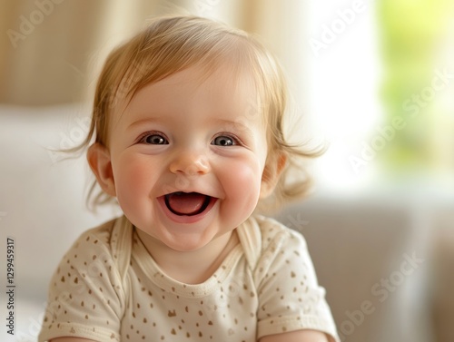 A joyful toddler beams with happiness, illuminated by soft natural light. The child's cheerful expression brings a sense of warmth and innocence to the neutral background