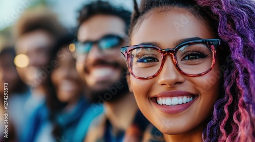 A joyful woman wearing glasses with colorful hair smiling brightly in a lively group, capturing the essence of friendship and celebration, surrounded by happy faces and bright colors.