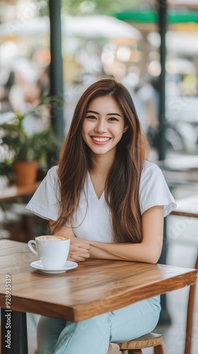 A joyful young woman sits at a table with a cup of coffee, radiating happiness in a welcoming café environment