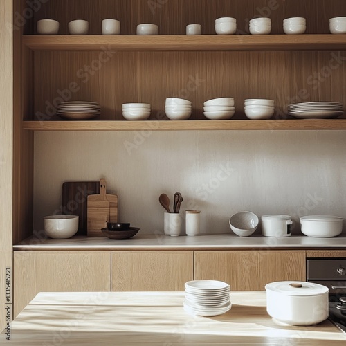 wood, shelf, bowl, plate, kitchen, storage, utensil, chopping board, decor, modern, minimalist, clean, white, stack, countertop, cabinet, home, style, design, arrangement, light, natural, empty, warm, food, dining, table, surface, lid, pot, cooking, space, texture, grain, brown, wooden, container, round, interior, display, simple, aesthetic, object, rustic, detail