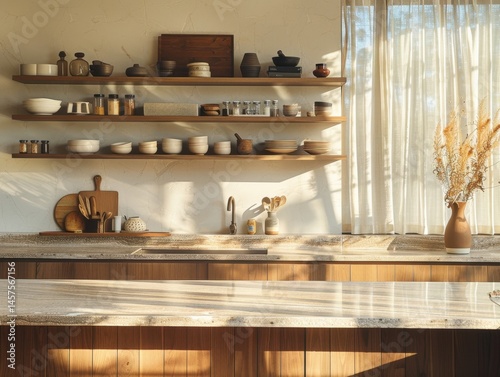 A kitchen with a countertop and a window. The countertop is made of granite and has a vase of flowers on it. There are many bowls and plates on the shelves above the countertop