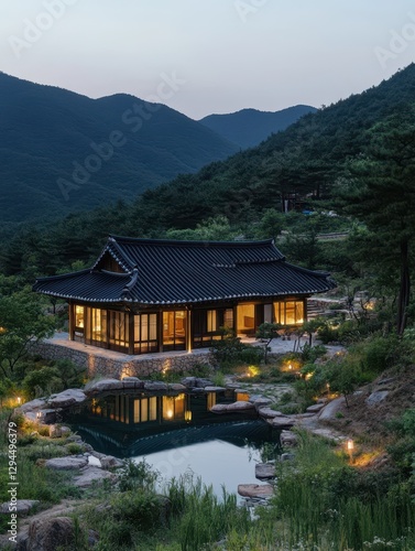 architecture, asian, calm, serene, traditional, peaceful, structure, building, landscape, mountain, evening, dawn, dusk, night, house, wooden, korean, nature, scenic, tranquil, beautiful, garden, water, duck pond, green, tree, sky, forest, culture, peacefulness, light, natural, naturalistic, beauty, twilight, illuminated, dark, exterior