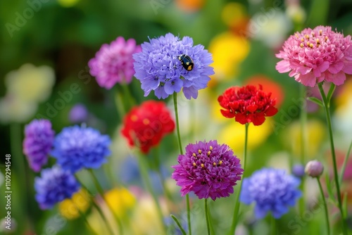 A ladybird on Starflower pincushions a flowering plant in the honeysuckle family with vibrant blooms in the background