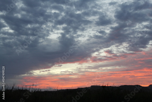 A landscape view of a sunset with vibrant red and orange hues in the sky, covered by dark, fluffy clouds. The silhouette of distant hills and grassy foreground adds depth to this creative work